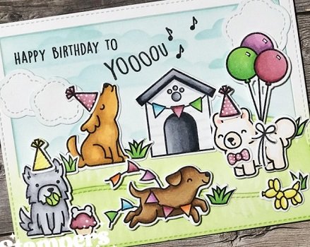 Hi everyone! I cannot stop creating with the Lawn Fawn Yappy Birthday and Yappy Birthday Add-On stamp sets. They are so cute! The last time I used these sets, I created a lot of extra pieces (you can see the previous cards here), so I decided to use some of them up and make another card—just with a slightly different look.