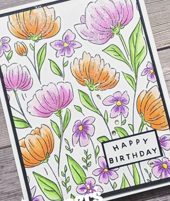 The Flowers Fair stamp set is a large background stamp set that covers an entire card base. I stamped it in Memento Tuxedo Black ink and coloured it with Copic Markers. The colours I used are: