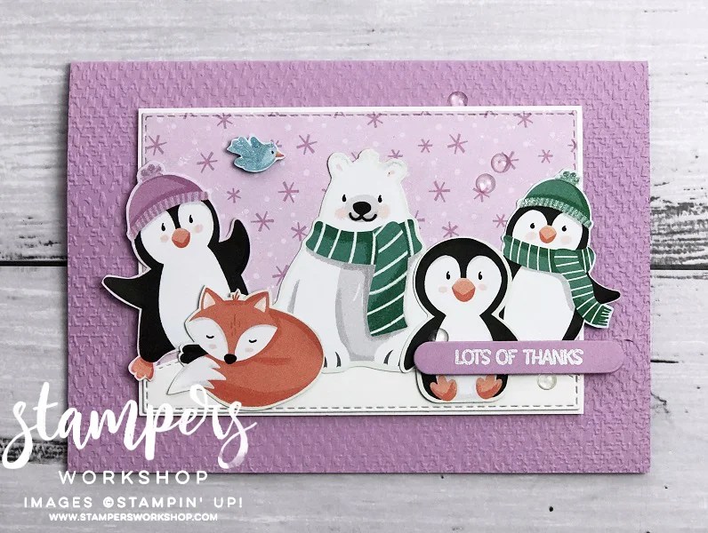 Hi, today I am sharing a super cute, and super easy card featuring the wonderful Penguin Playmates Designer Series Paper pack. This fabulous paper is one that you could choose as your FREE item when you place a qualifying order during Sale-A-Bration. What I love about it is not only the colours and the adorable imagery but that the paper coordinates perfectly with the Penguin Place stamp set and coordinating Penguin Builder Punch (also available as a bundle for a 10% discount).