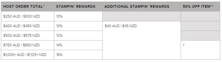 From 4 May–14 June 2021, qualifying orders (see chart below) will receive the usual Stampin’ Rewards PLUS additional rewards! Stampin’ Rewards are available to those who place individual orders that meet the order totals shown here.