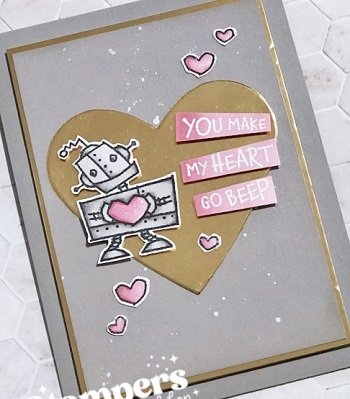 To finish things off, I popped up the robot and sentiment with foam tape for a bit of dimension, added some white paint splatter for texture, and of course, a touch of shimmer to the hearts — both on the robot and those scattered around the card.